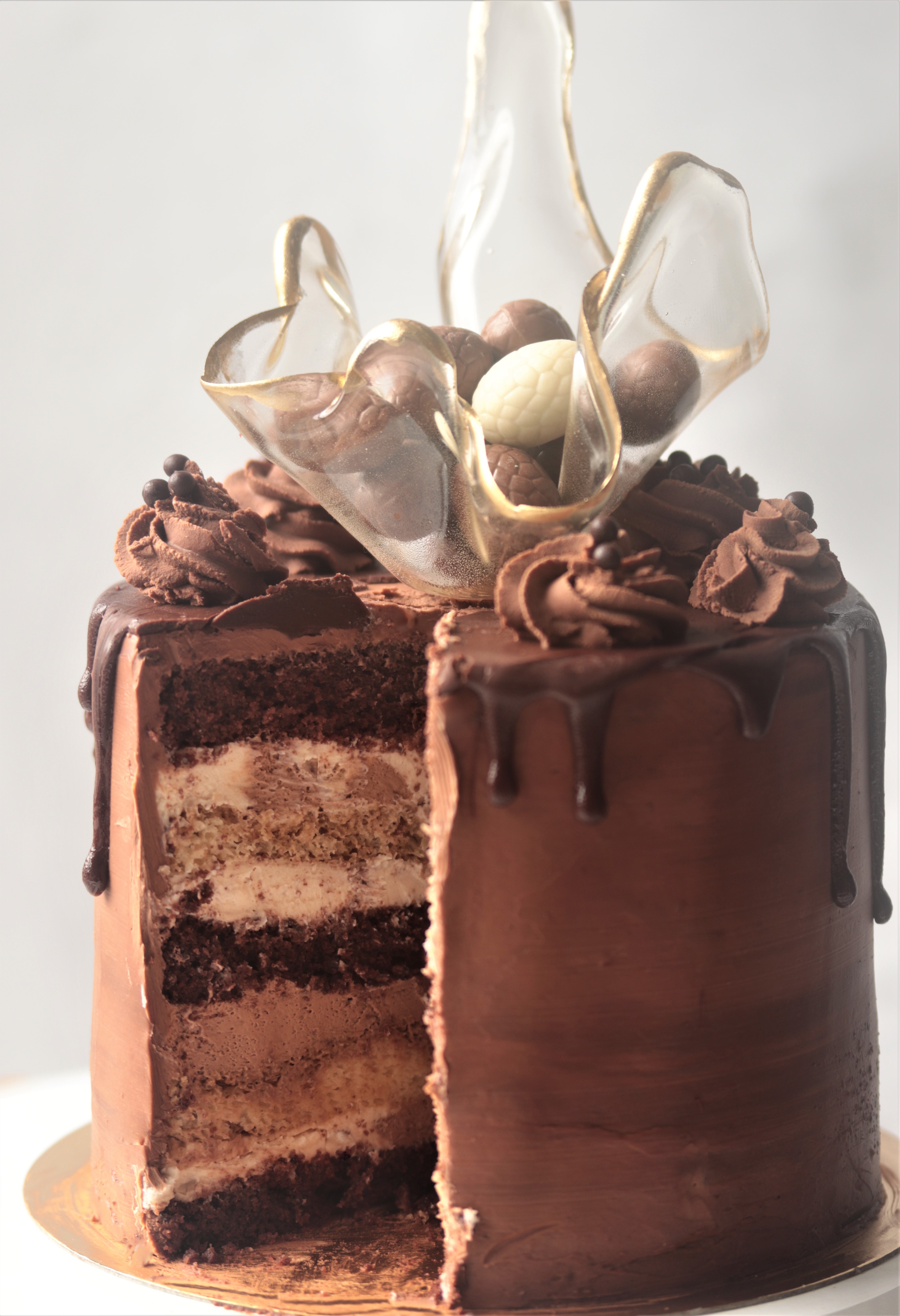 Een lichte vanille- en chocoladeiscuit wordt gecombineerd met een espressosmaak en aangevuld met een mascarpone crème, namelaka en whipped ganache.
