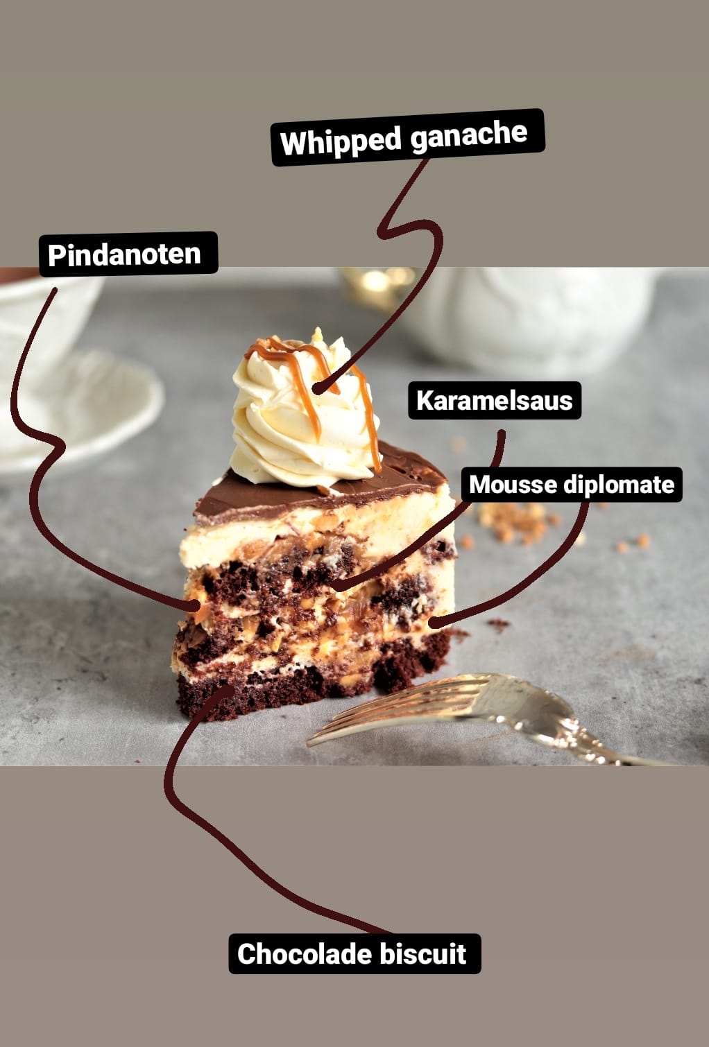 Eén laag chocolade biscuit, binnenin blokjes biscuit, geroosterde pindanootjes, karamelsaus en dit allemaal omringd door mousse diplomate.