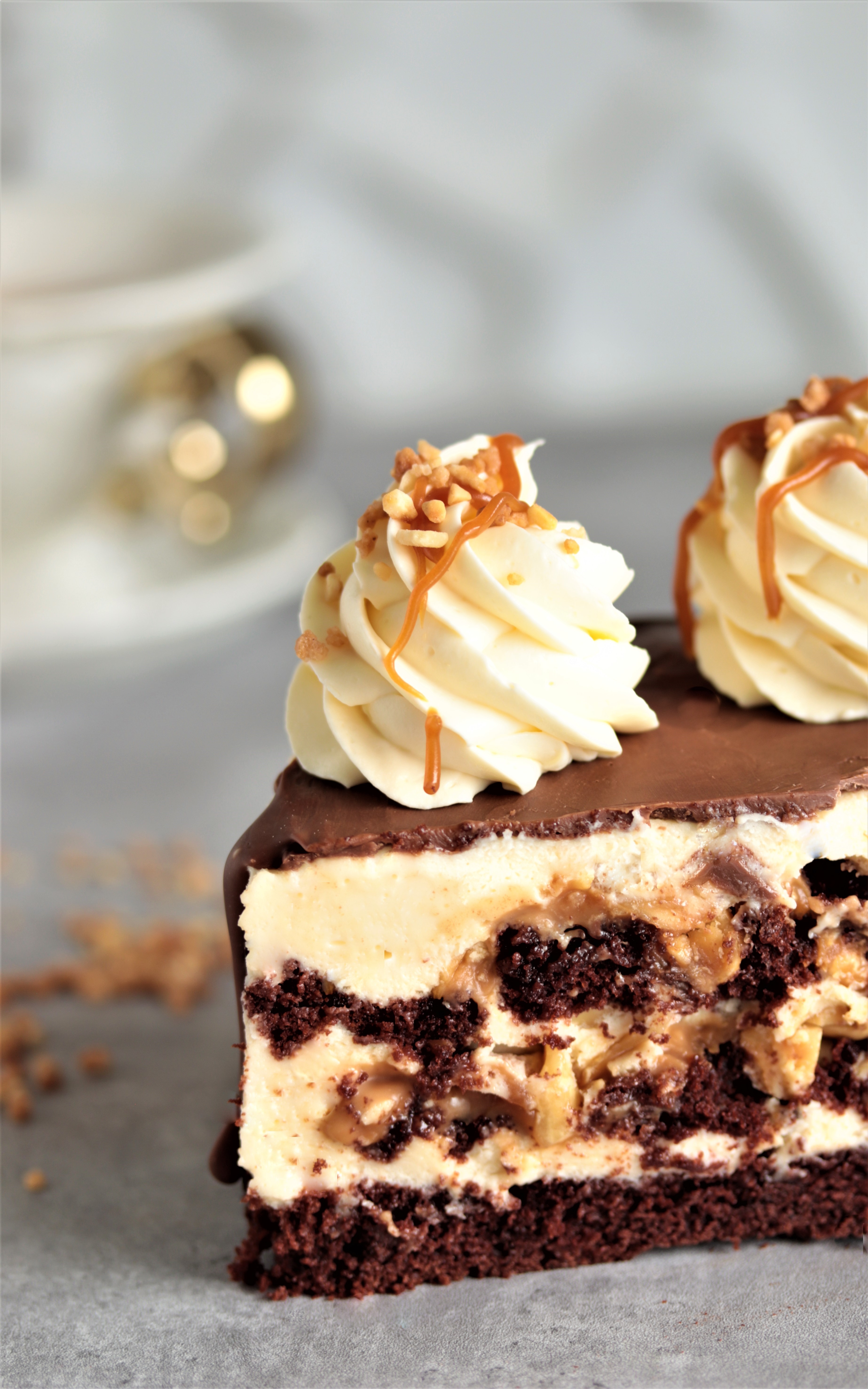 Iedereen kent wel de chocoladebar Snickers. Er zijn heel wat taart variaties gemaakt op de Snickers, echter mijn versie is nog een tikkeltje anders.